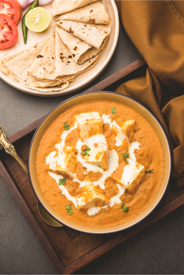Soft paneer cubes simmered in a rich tomato-butter gravy with cream and gentle spices. Smooth, mildly sweet, and utterly comforting.