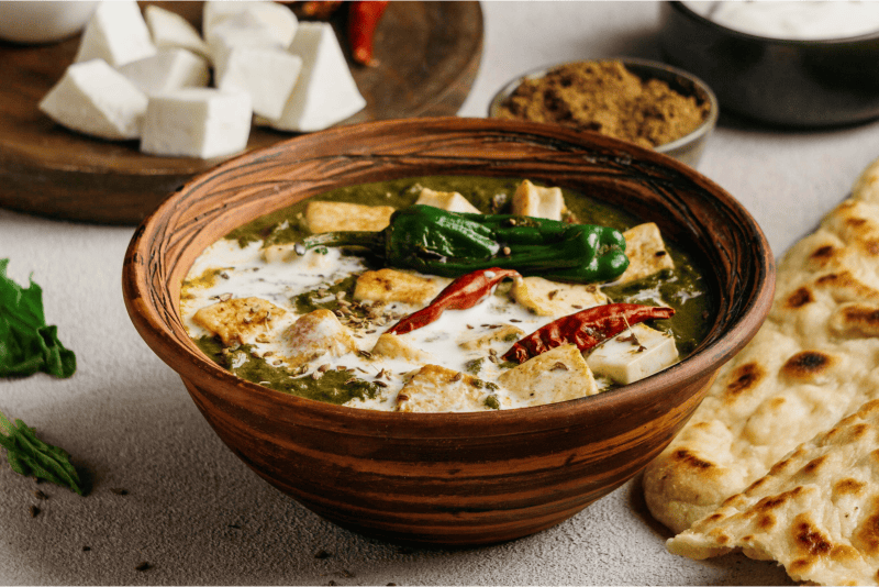 Cottage cheese or potatoes cooked in a rustic spinach gravy with garlic, ginger, and whole spices. Earthy, wholesome, and hearty.